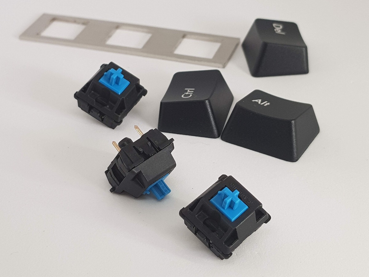 3つのキースイッチは取り外し可能。適合するMXキーであれば他の特性のキーに取り換えることもできます。キースイッチのベースにはMXキーの好感度を生かす1.5mm厚のステンレス板を採用しました。フニャリとした底着き感にならない本物のキーボード以上の肉厚金属ベースです。